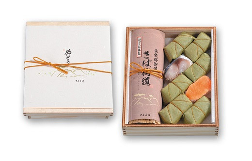 醤油とみりんで味付けし、ふっくらと焼き上げた鯖と白ごまシャリの相性が抜群の「焼さば鮨」と、定番のさば・さけの柿の葉寿司を詰め合わせた、誰もが喜ぶひと品。