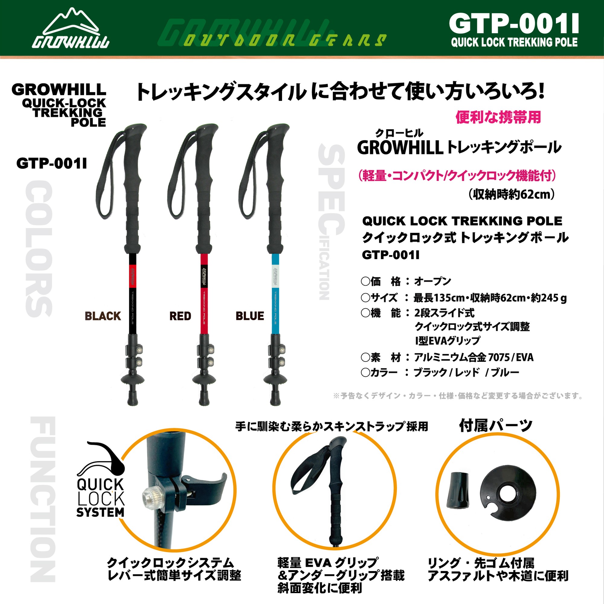 GROWHILL クイックロック式 トレッキングポール レッド 1本 / ジェイクリエイト アウトドア 軽量 EVAグリップ 奈良県 田原本町