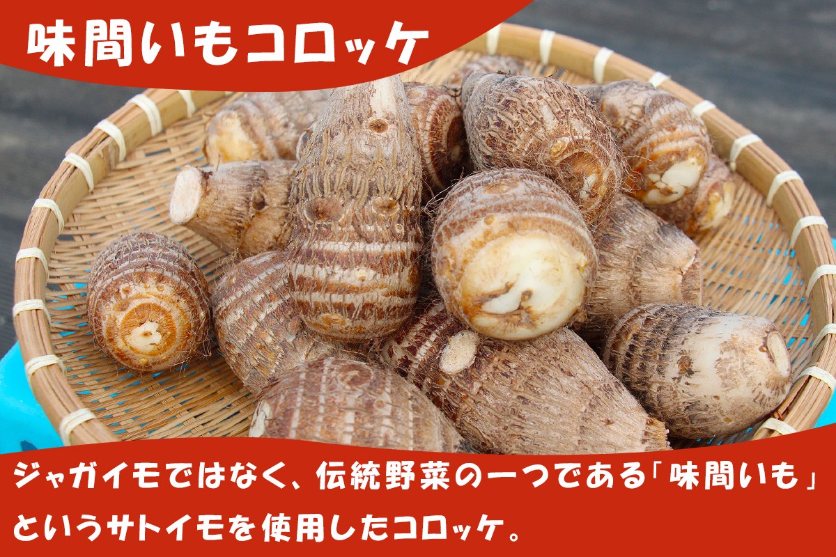 味間いもは、きめ細かく粘りの強いのが特徴で、コロッケにするとクリームコロッケのような食感に似ており、ねっとりなめらかで、ほのかに優しい甘みがあります。