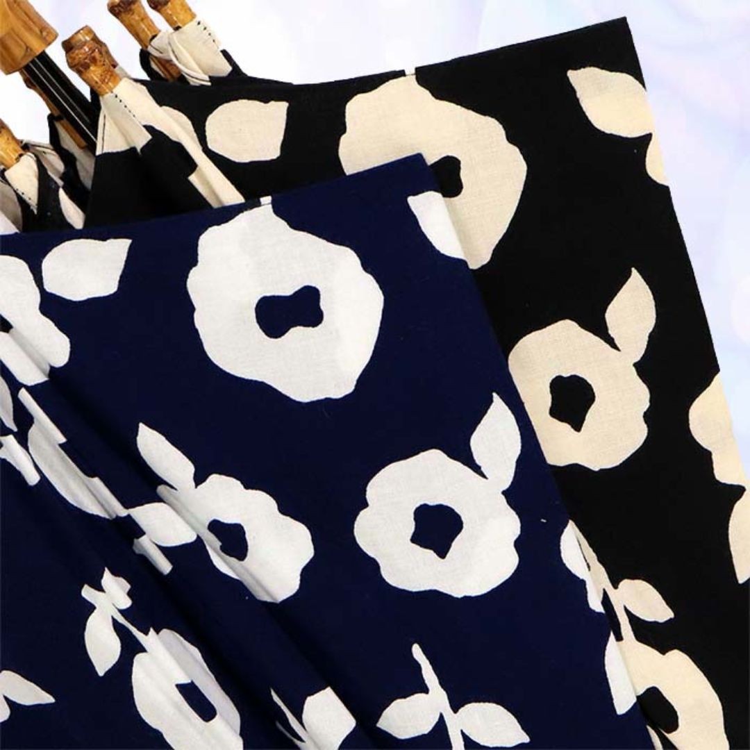 まぶしい日差しに映えるブラック、ネイビーのベース色にポップな花模様がとても涼しげ。