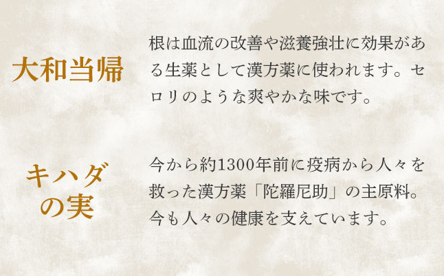 ◆大和当帰・・・根の部分は婦人病、冷え性、滋養強壮に効果があるとされています。爽やかな風味をもたらしてくれます。