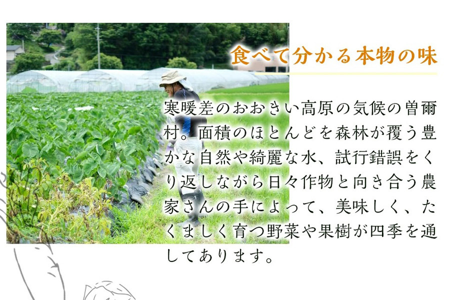 曽爾村は標高が高いため、一般的な野菜のシーズンとは少々ズレがあります。また、村内に大規模農家はおらず、気候条件に非常に左右されますので、上記の通りの野菜にならない可能性もあります。この点のみご了承いただければ幸いです。