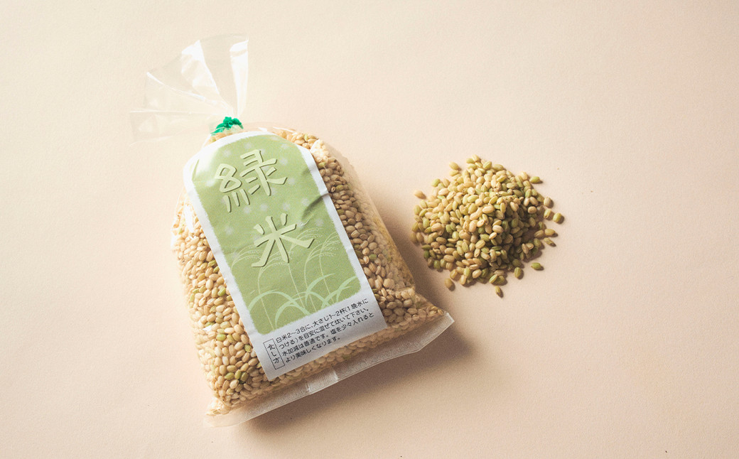 緑米は稲の穂が黒く、玄米は緑黄素を多く含んでいます。
