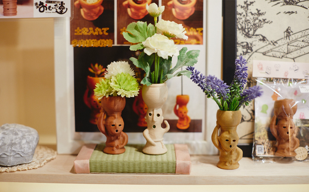 メーカーで研究職に従事していた、オーナーの西川勝博さんが研究職時代の知見を活かし、3Dプリンターで作るグッズが人気のショップ。埴輪や村内にある名所の亀石などをリアルに再現した小物がたくさん揃っています。