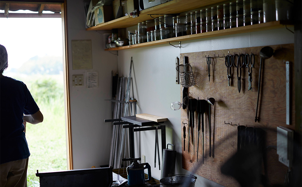 溶解炉で約1200度の火を使い、硝子を溶かして竿に巻き取り、吹き竿で息を吹き入れて中を塩梅よく空洞にします。溶解炉の扉を開けると工房内は熱気に包まれます。ロックグラスの形を整えたら、一晩かけて冷まして、できあがりです。