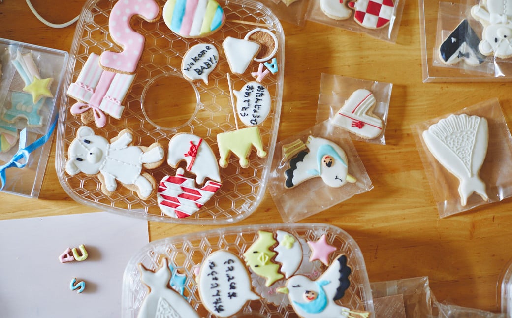 「どんなものを作りたいのかを予めお聞きし、事前にこちらでサンプルを製作。このサンプルをもとに、お客様の塗りたい色を相談しながら、デコレーションしていきます。工房のスペースが小さいので、基本的にはおひとりでいらしていただくのがベターですが、グループでのご参加もOKです。たとえば、ご家族がパパへのプレゼントとして手づくりするのも良いですし、少人数の心あたたまる結婚式を予定されているカップルでしたら、結婚式用の席次をアイシングクッキーで作り、共同作業で用意する、なんていうのも素敵だと思います。2週間程度は日持ちしますので、ご予定に合わせてお越しください。リクエストがなければ、こちらでシーズンに合ったクッキーを提案いたします」(西本さん)