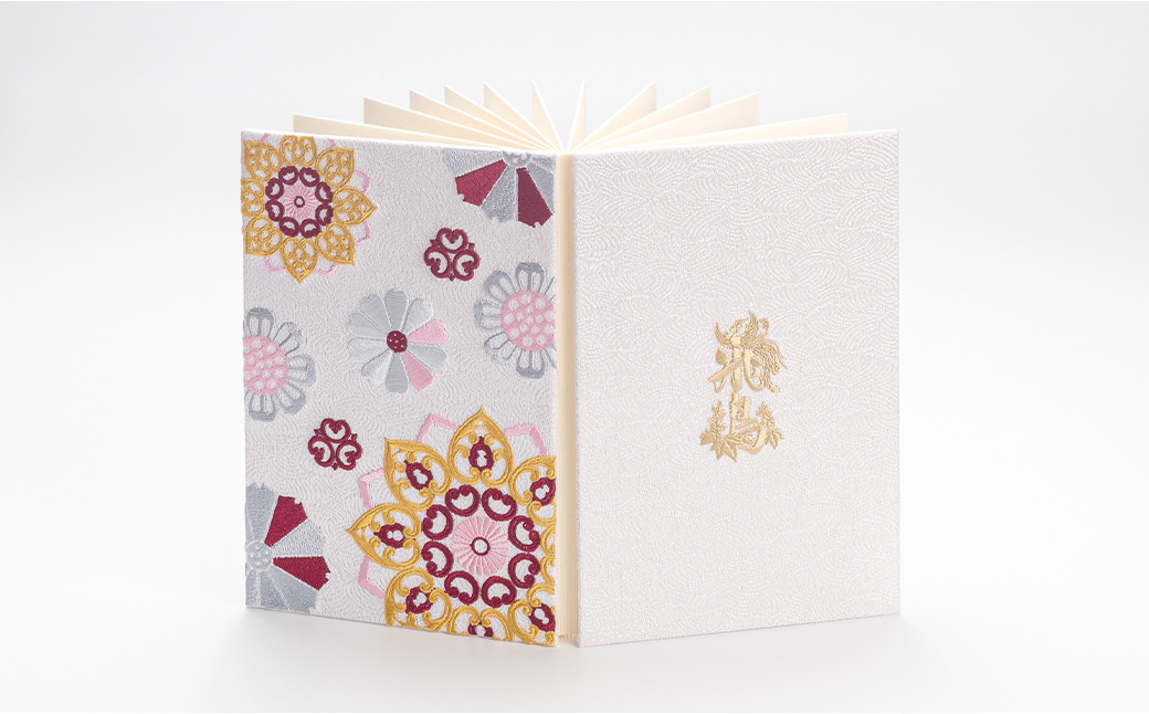 刺繍は、表側が約38,000針、裏側が約4,200針と非常に手間のかけられたもので、思わず触れたくなるこだわりの質感です。製本は一冊一冊丁寧に、手作業で仕上げています。