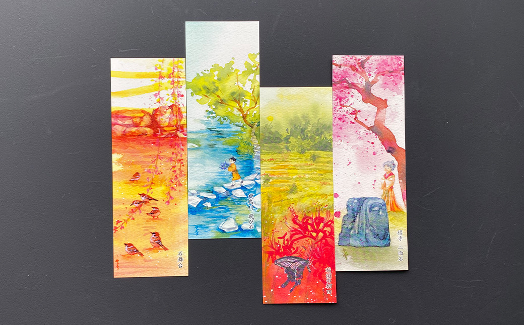 こちらは明日香村の情景を水彩で描き、「いにしえのあしあと」と題したしおり2組4枚セットです。