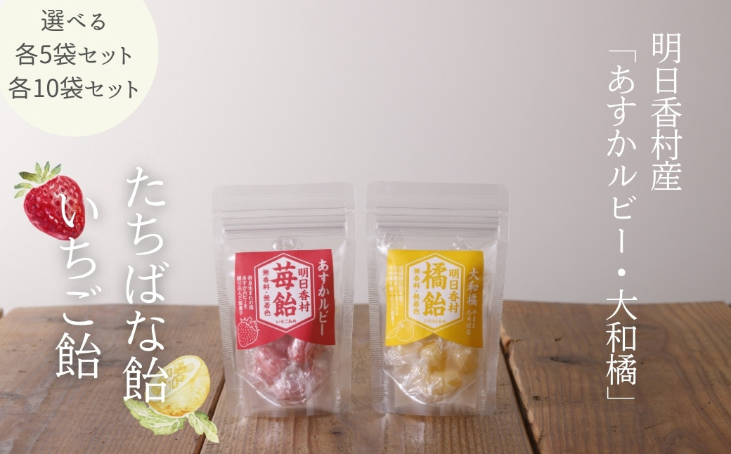 奈良県を代表する明日香村産ブランドいちご「あすかルビー」、明日香村の村花でもある「橘」のフリーズドライを贅沢に練り込んだキャンディーをセットにしてお届けします。あすかルビーと大和橘の香りと味わいを無香料・無着色でお届けします。