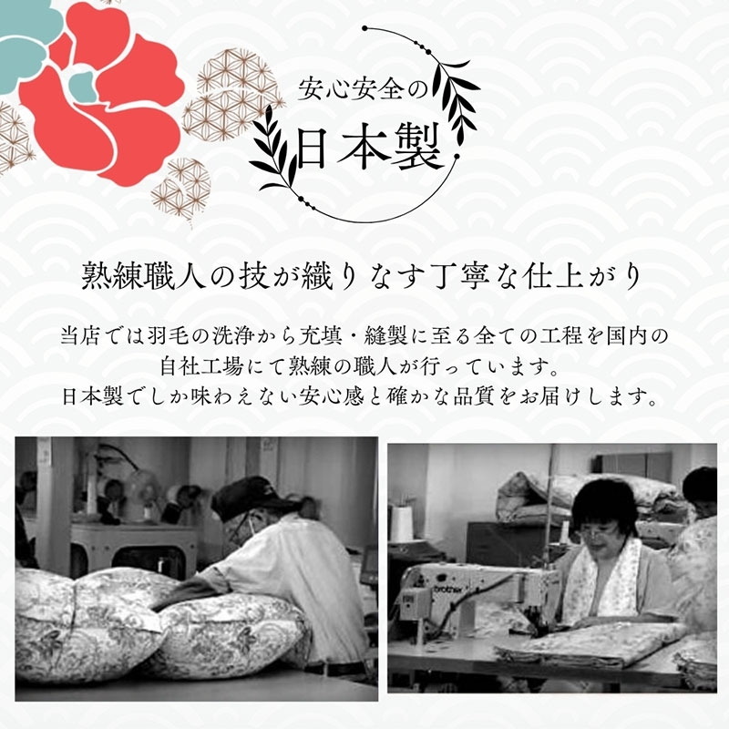 羽毛は国内工場で150℃以上の高温乾燥を伴うパワーアップ加工を施しています。