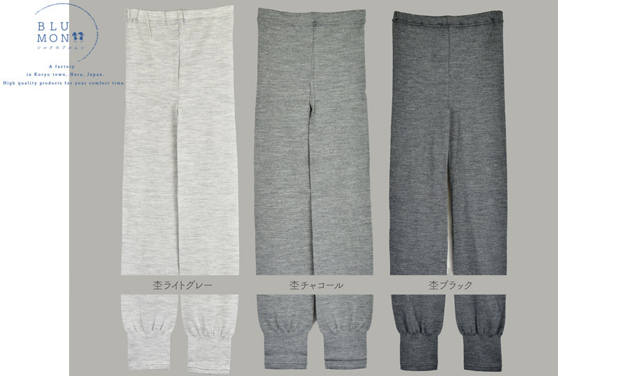 肌に当たる部分はシルクとなります。天然素材90%以上を実現! BLUMON(ブルムン)スウェットレギンス裾しぼり(シルクウール)///レギンス 部屋着 インナー シルク 天然繊維 日本製 肌触り 柔らかい かわいい おしゃれ 奈良県 広陵町