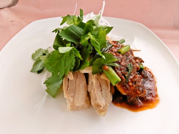 茹でた鶏肉を冷やしてスライスしたものに、香辛料や薬味がたっぷり入った風味豊かな辛いソースをかけた冷菜です。