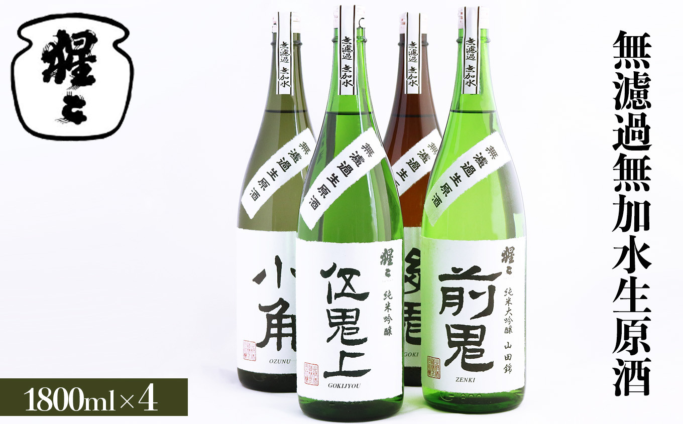 蔵出しの無濾過無加水生原酒の純米大吟醸・純米吟醸酒1.8Lの4本セットです。