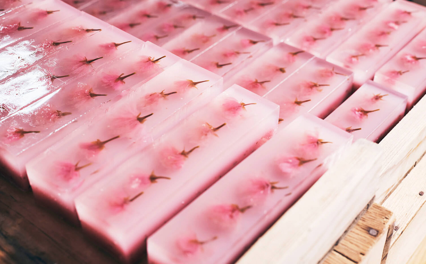看板商品の山桜ようかんは吉野の春を堪能できると人気の和菓子。1層目は桜花の風味を閉じ込めた寒天、2層目には吉野葛を敷き詰め、3層目には桜葉入りのさくら餡やあずき餡となっており桜が浮かびあがる姿が美しい。
