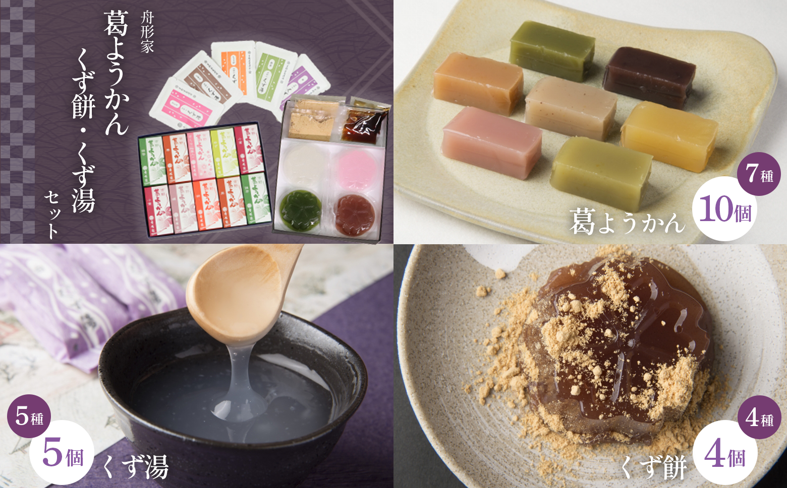 | 容量 | 葛ようかん7種類10本入り(小倉×2本・栗×2本・抹茶×2本・柿×1本・桜×1本・ゆず×1本・練×1本) くず餅(こしあん・抹茶・白・桜)各1個 くず湯5袋入り(桜×1袋・しるこ×1袋・生姜×1袋・抹茶×1袋・白×1袋) |