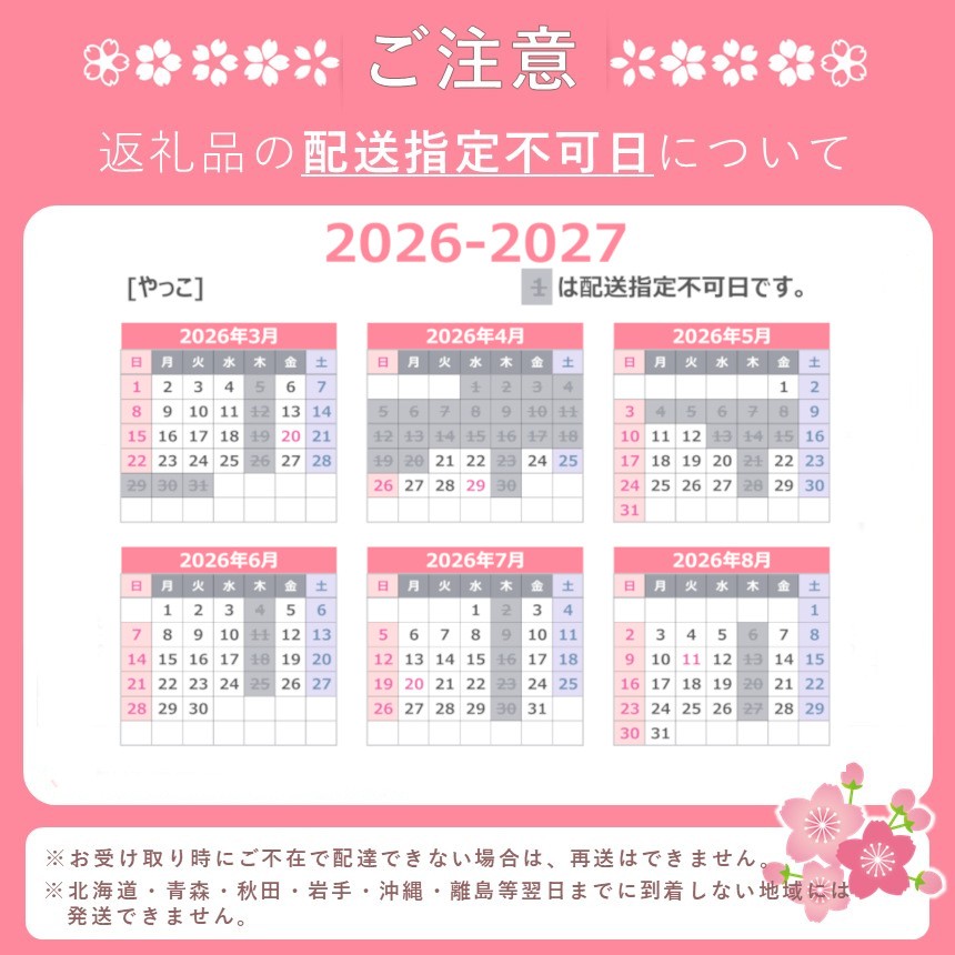 【発送に関してのお知らせ】 配送カレンダーをご確認の上、お申込みから2週間後以降の配達希望日時をご指定ください。 お申込みを多数いただいた場合など、ご希望に添えない場合はご連絡いたします。 ※お受け取り時に不在で配達できなかった場合、再発送できません。 ※北海道、青森県、秋田県、岩手県、沖縄県、離島など翌々日までに到着しない地域への配達はできません。 夏季:クール便にて発送 |
