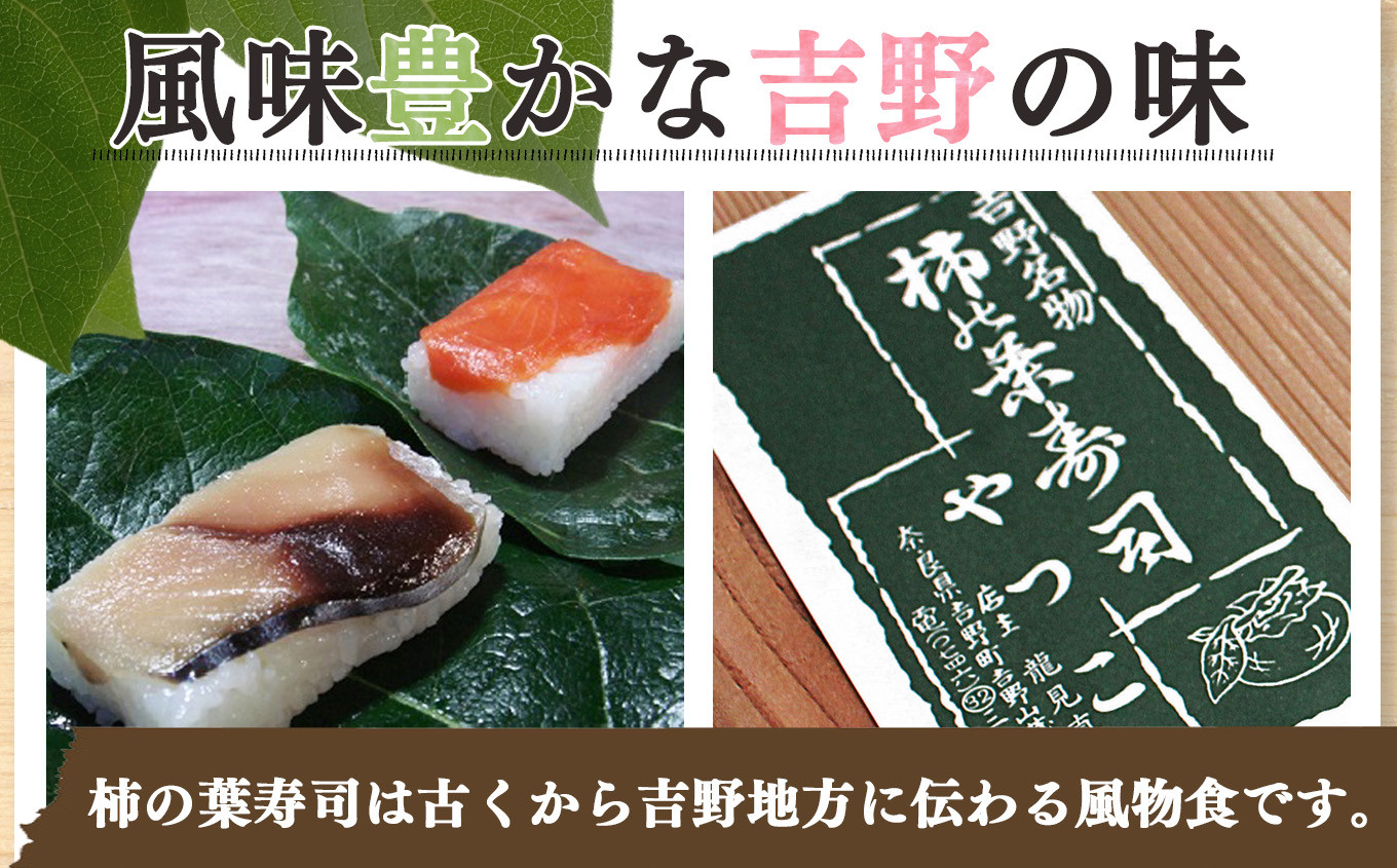大正元年創業の老舗の味を守り続け、塩だけでしめた新鮮な鯖と鮭をまろやかな寿司飯と共に柿の葉に包んで、吉野杉の木箱に押してお届けします。