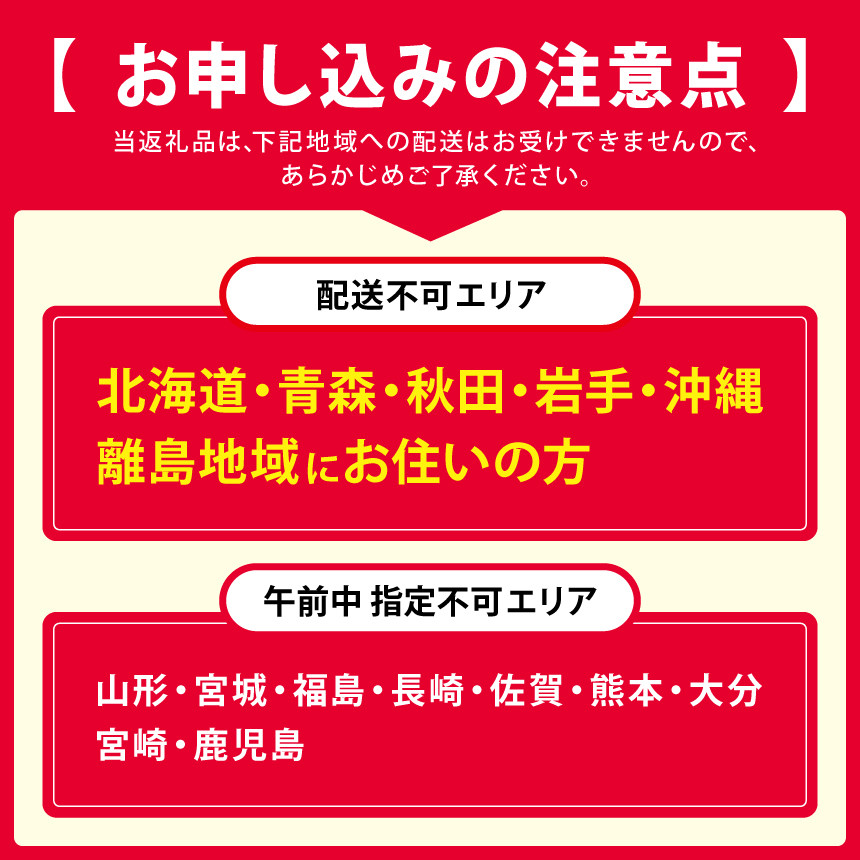 【発送に関してのお知らせ】 配送カレンダーをご確認の上、お申込みから2週間後以降の配達希望日時をご指定ください。 お申込みを多数いただいた場合など、ご希望に添えない場合はご連絡いたします。 ※お受け取り時に不在で配達できなかった場合、再発送できません。 ※北海道、青森県、秋田県、岩手県、沖縄県、離島など翌々日までに到着しない地域への配達はできません。 夏季:クール便にて発送 |