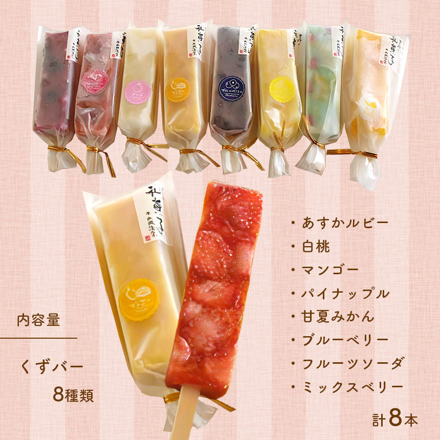 | 容量 | くずバー8種類 8本入 (あすかルビー・白桃・マンゴー・パイナップル・甘夏みかん・ブルーベリー・フルーツソーダ・ミックスベリー) |