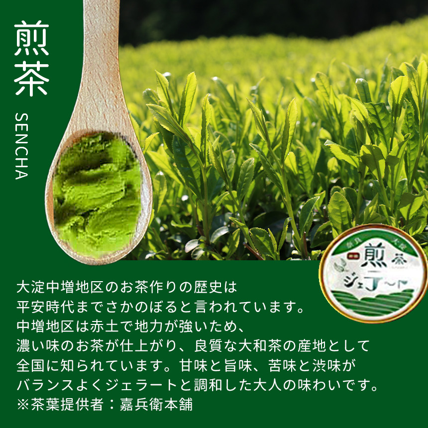 初摘み煎茶ジェラート 90ml:牛乳、グラニュ糖、生クリーム、ぶどう糖、脱脂粉乳、煎茶(奈良県大淀町産)、安定剤(増粘多糖類)