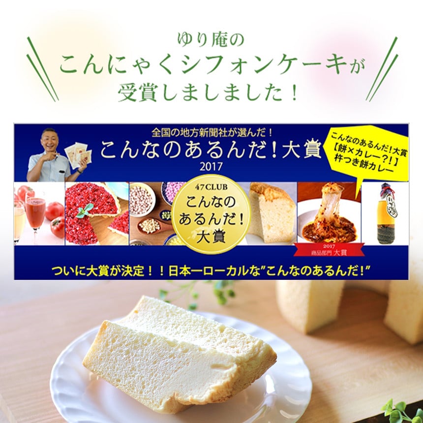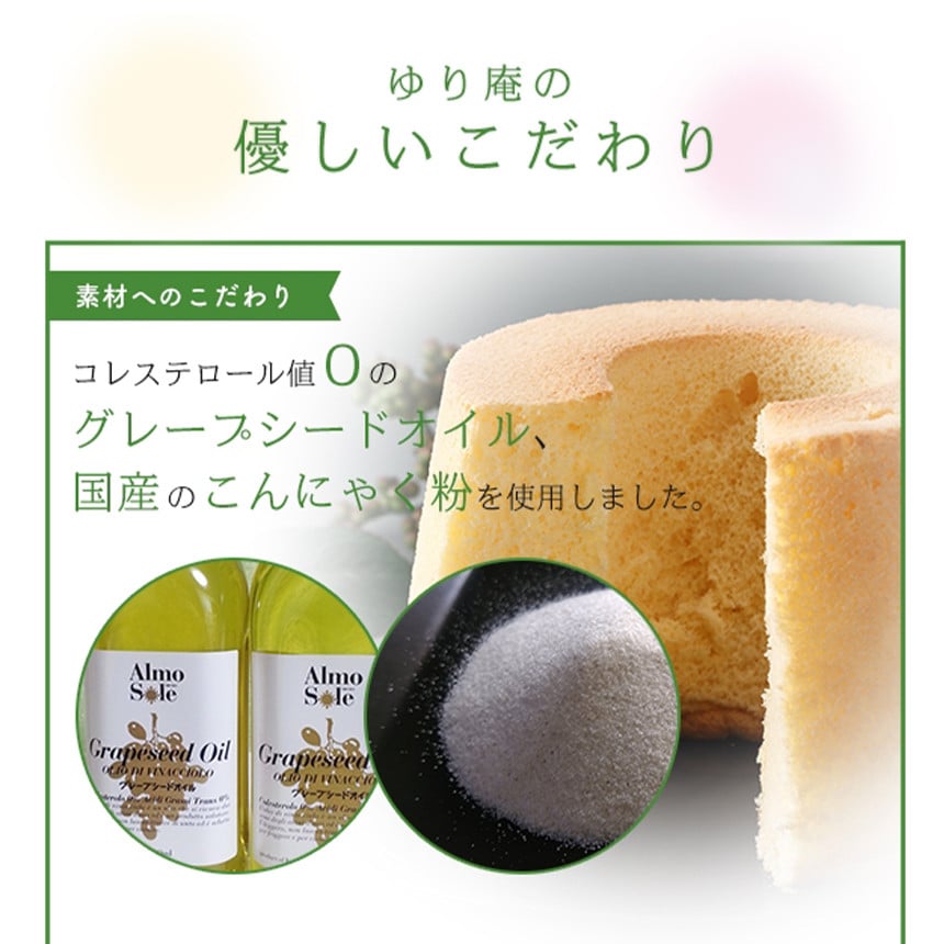 『こんにゃくシフォンケーキ』は初孫の誕生がきっかけで、少しでも添加物がなく、優しいおやつを食べさせたいおもいで、作りました。こんにゃくの膨張性・保水性を利用して、ベーキングパウダー未使用・ゆり庵比ですが30%カロリーオフに成功・オイルはコレステロール値0のグレープシードオイルを使用し、しっとりふわふわのシフォンケーキに仕上げております。