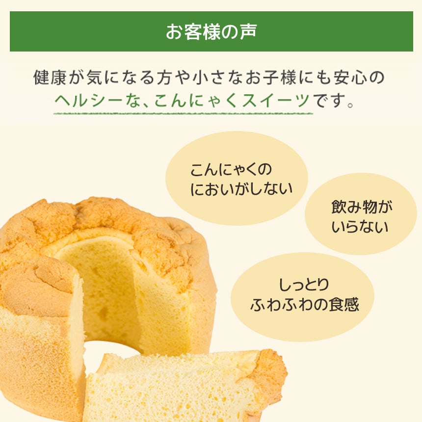| 容量 | こんにゃくシフォンケーキ4種類 ・プレーンカット ・プレーン(てんさい糖)カット ・マーブルカット ・紅茶シフォンカット |