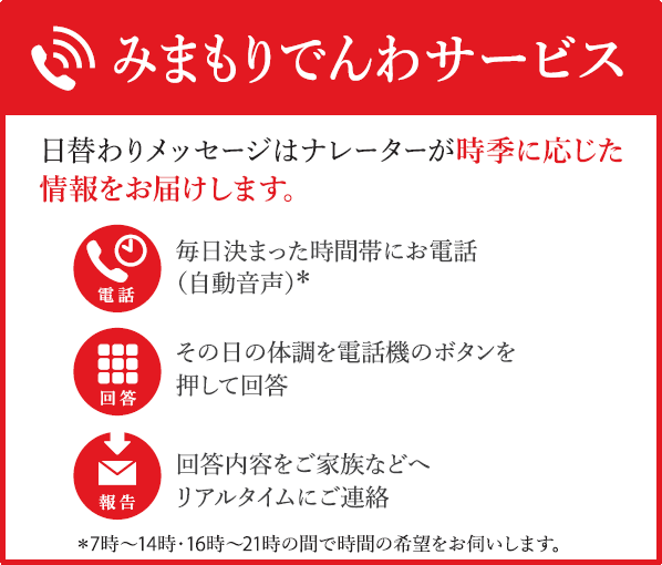 ふるさと大淀町で暮らす親御さまに、毎日お電話(自動音声)で体調確認を行い、その結果をご家族様へお知らせするサービスです。