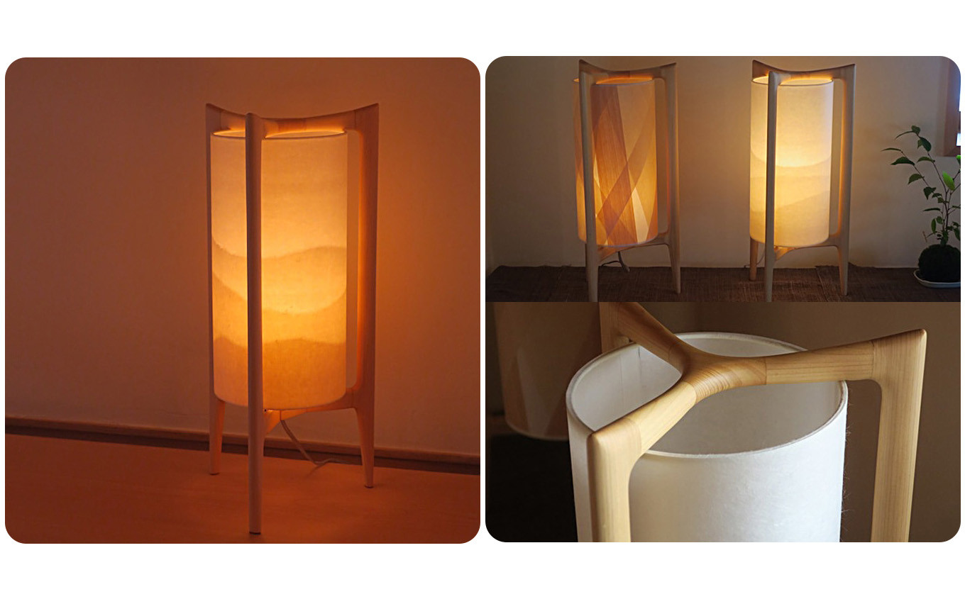 この灯りは家具職人に依頼し制作されました、吉野檜の優しく美しい3本脚のフレームが印象的です。