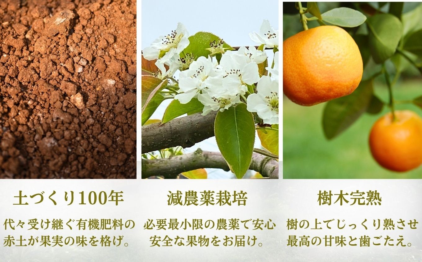 祖父の代から受け継ぐ赤土に、米ぬか・油かす・石灰質資材をブレンドし、微生物の働きを活かした”生きた土”が果肉に深いコクを与えています。