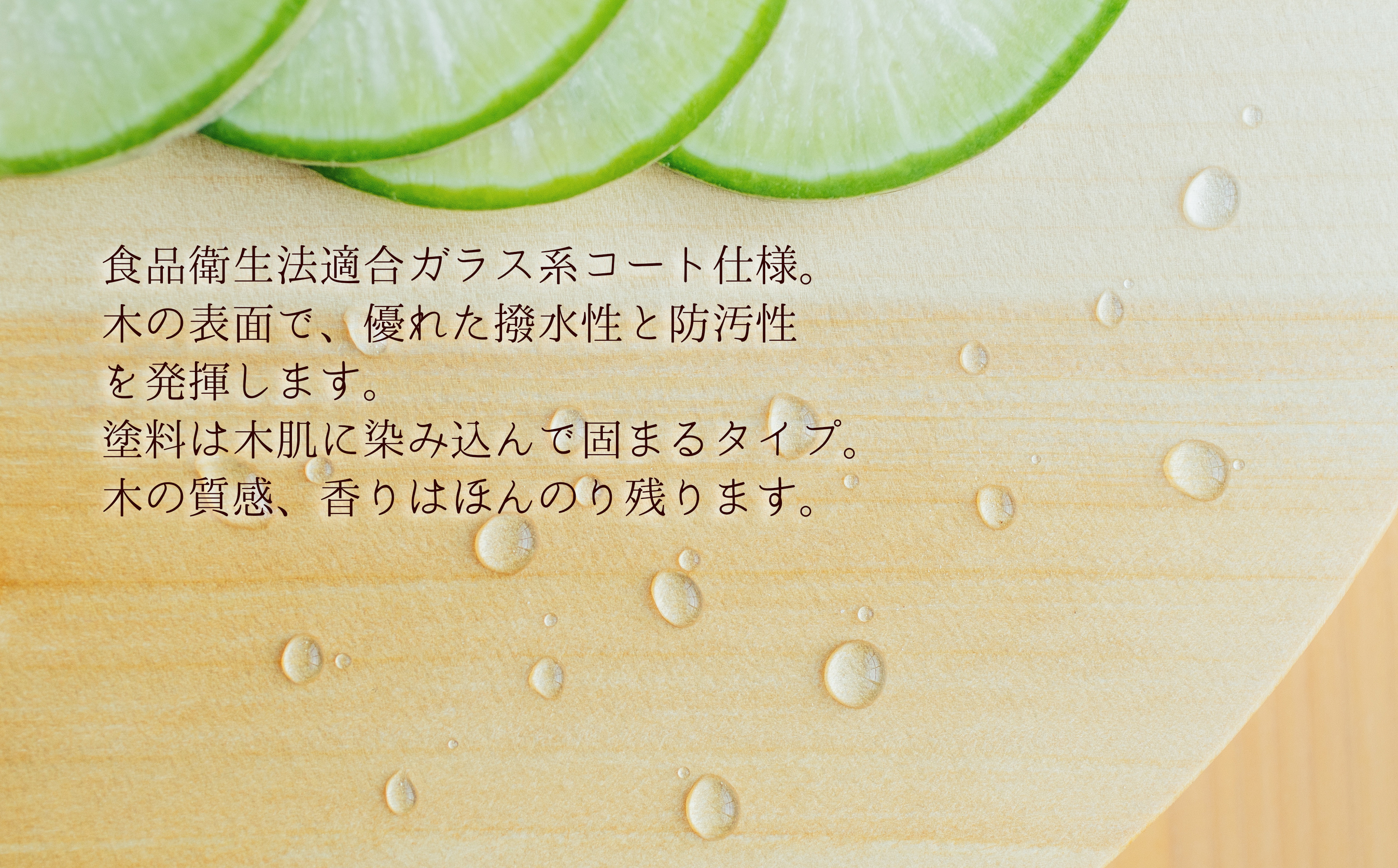 まな板表面にはガラス・セラミック系コート塗料(食品衛生法の規格基準をクリアした)を塗装することにより撥水性と防汚性が向上し、より長くお使いいただけます。