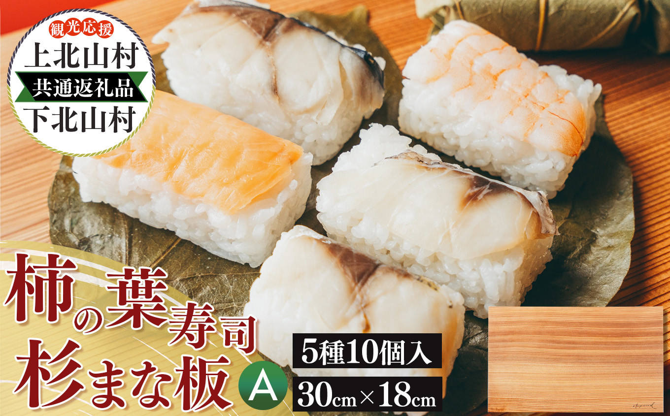 上北山村から『柿の葉寿司』、下北山村からは『杉のまな板』をそれぞれお送りします! 【上北山村×下北山村 観光応援 共通返礼品A】柿の葉寿司 5種10個入と杉のまな板 | すし 寿司 スシ お寿司 おすし オスシ 柿の葉ずし 一枚板 まな板 柾目 追柾目 奥吉野杉 Sサイズ 30cm 災害支援