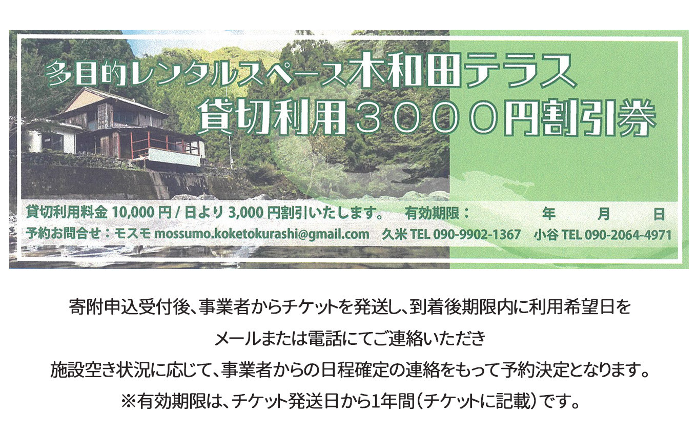 自然豊かな紀伊半島の奥山で癒しのひと時を♪ レンタルスペース「木和田テラス」利用割引券(3,000円分)| レンタル 利用券 体験 チケット 多目的 会場 キャンプ デイキャンプ 川遊び 自然観察 出張ワーク 芸術展示 コンサート マッサージ ヨガ 空き家 木和田 テラス 川 清流 レンタル 二階建て 解放感 12畳 14畳 モスモ 自然 紀伊半島 奥山 癒し 奈良県 上北山村