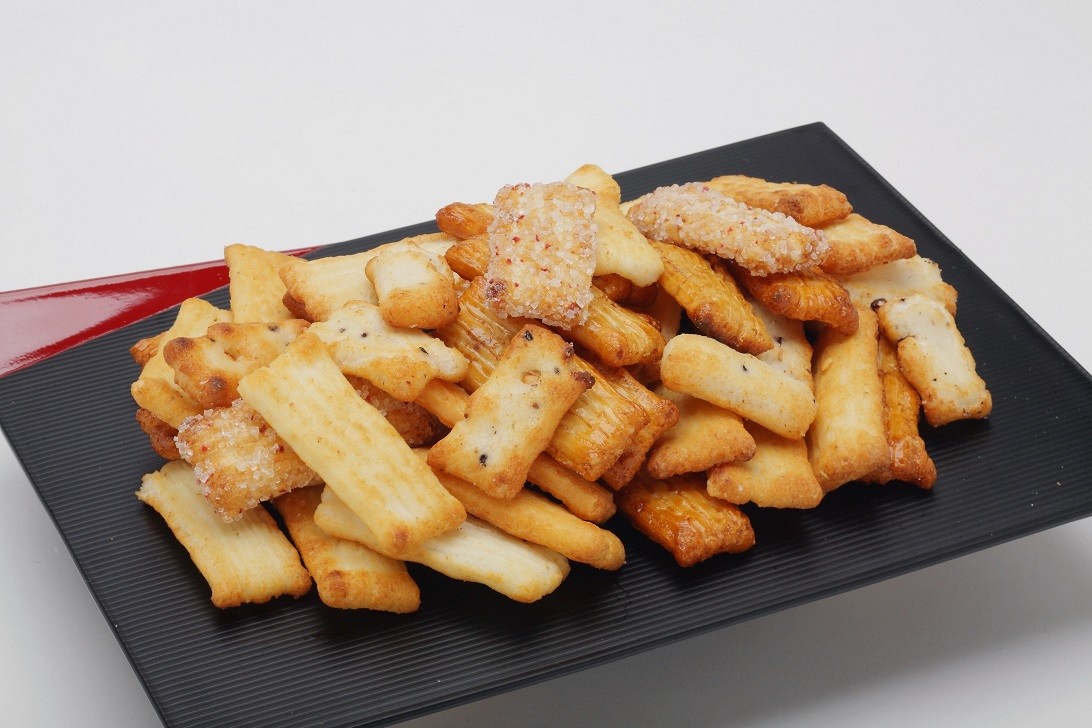 昔ながらの製法を守りながら、セイロで蒸し、杵で搗いている米菓、焼きあられです。ごぼう、青海苔醤油、マヨネーズ、みたらし団子風、梅ざら、海老サラダの6種類の味が入っています。