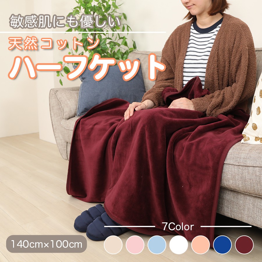 シール織綿毛布ハーフケットひざ掛け×1枚 カラー:アイボリー、ピンク、ブルー、ベージュ、オレンジ、紺、エンジ サイズ:100cm×140cm 製造地:和歌山県橋本市■原材料 綿100%
