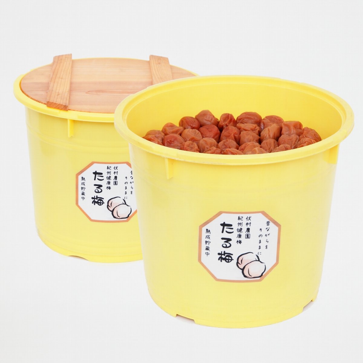 たる梅は、当園自家栽培の完熟南高井梅を天然塩のみで漬け込んで天日干したる詰め貯蔵中の梅干しです。年月の経過で熟成の度合いが進みどんどん旨味が出てきます。特に梅の成分が溶け出し凝縮して底に溜まった「梅つゆ」は飲み物に混ぜてたり、調味料として重宝されています。これはたる梅にしかできないものです。塩分約20%濃いと思われる場合は容器にお湯を注いで浸したりすればオリジナルの無添加うす塩梅干しを作る事も出来ます。日々の一品からお店の業務、インパクトのある贈り物や災害時の貯蔵用と多数のお求めを頂いております。