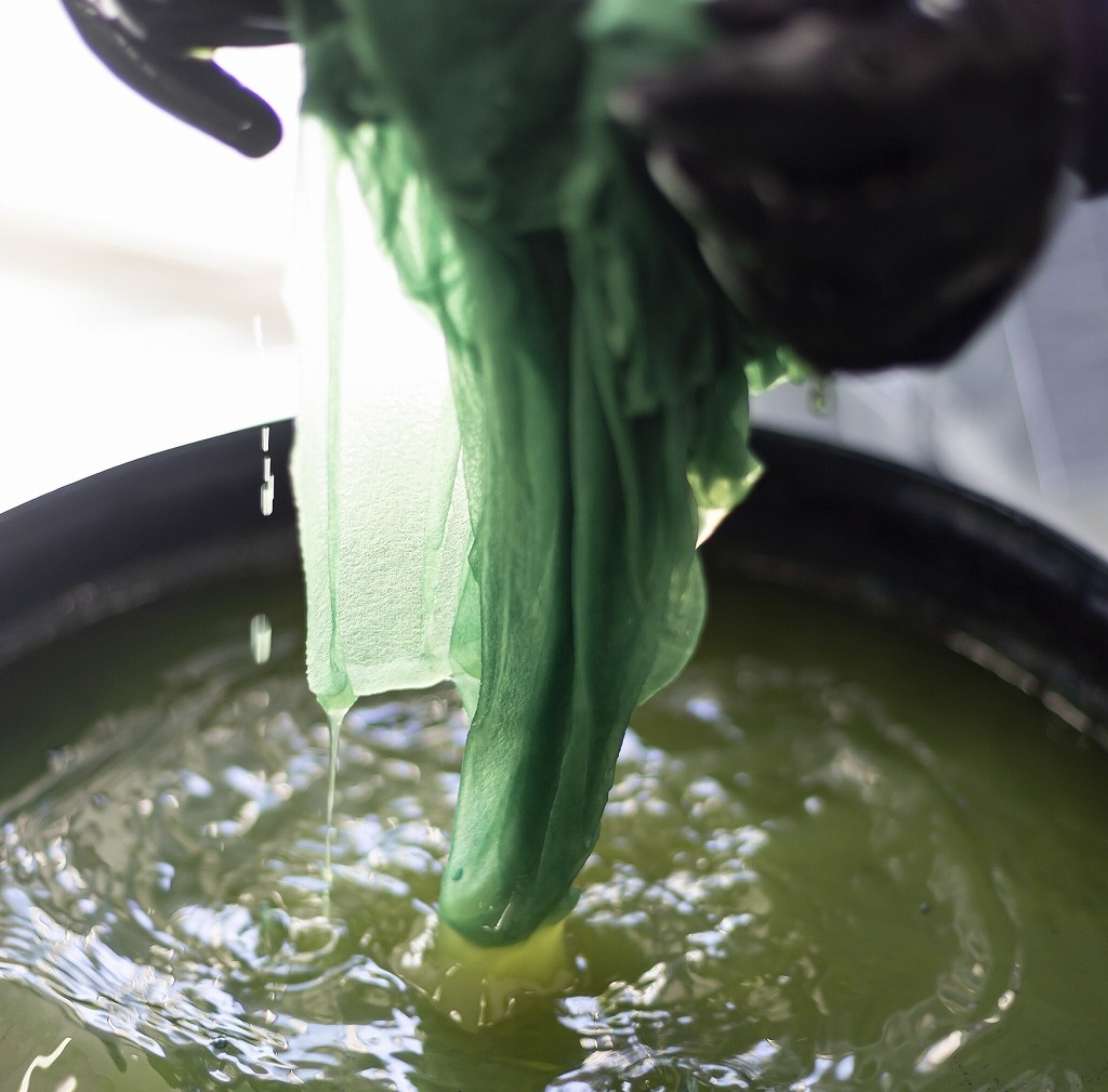 藍染め、古来薬草染めです。特に藍染は飛鳥時代(592-710)より伝わる。みなみ工房では自家農園で無農薬で栽培し、収穫・乾燥・発酵・すくも作りまで一貫した染料を生産しています。また、化学薬品による媒染をしない事にこだわっています。染めも織物も1つひとつを手がけています。そこには、一点物だけが存在します。作品は、オーガニック等天然素材にこだわっています。製造後の残滓は、田畑に再利用し循環しています。みなみ工房は認可法人であり、障害者と共に働いています。各々が発達し、自立をめざしています。