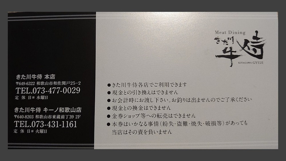 和歌山市内のMeat Dining きた川牛侍各店(下記)にてご利用頂けるお食事券(30.000円分)です。