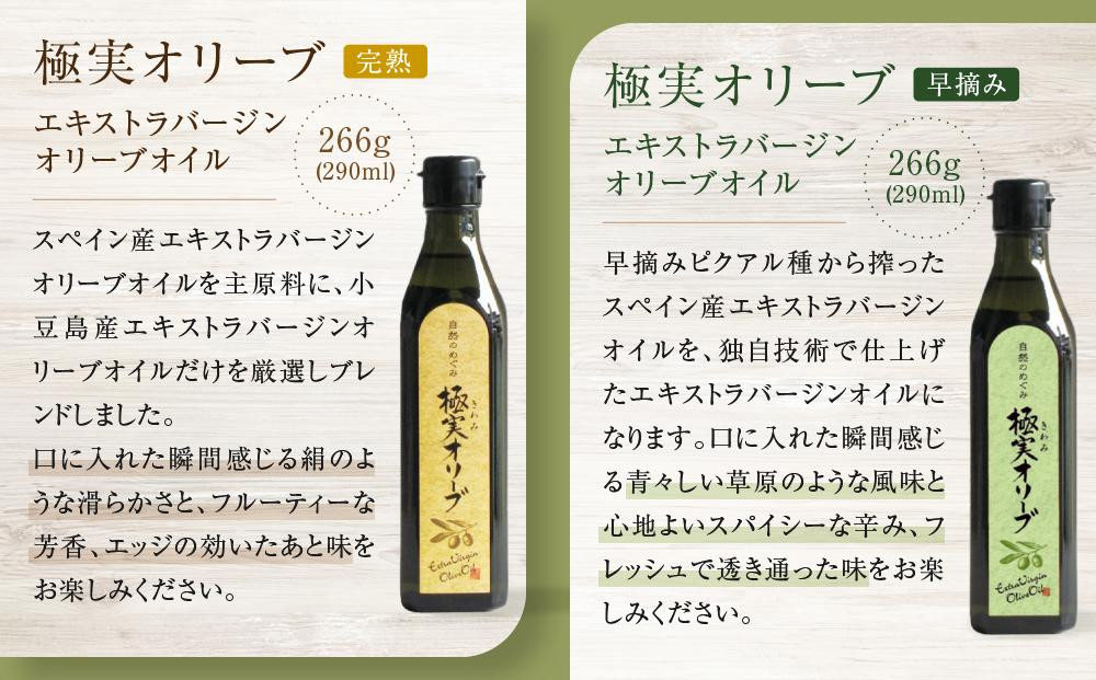| 容量 | ・極実オリーブ (早摘み) エキストラバージンオリーブオイル <266g(290ml)×1> ・極実オリーブ (完熟) エキストラバージンオリーブオイル <266g(290ml)×1> 【原材料名】 ・極実オリーブ (早摘み) エキストラバージンオリーブオイル:食用オリーブ油(スペイン産) ・極実オリーブ (完熟) エキストラバージンオリーブオイル:食用オリーブ油(スペイン産、小豆島産) |