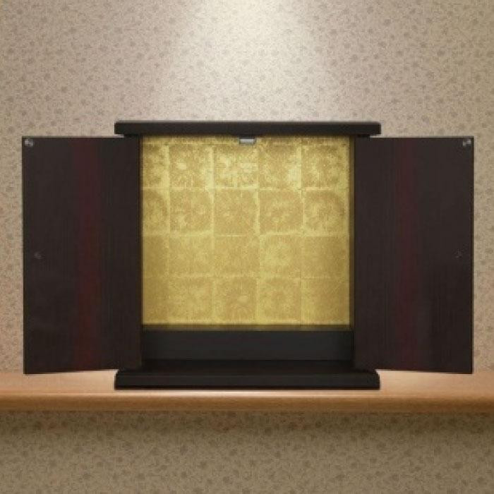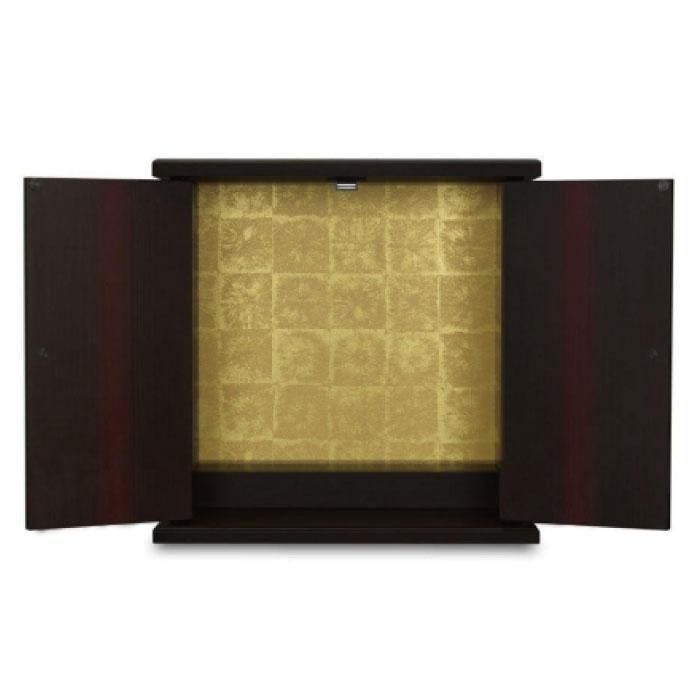 大きなお仏壇をお求めでない方におすすめしたい、棚置き出来るサイズのお仏壇です。コンパクトなだけのお仏壇はほかにもありますが、小さくても高級な質感を醸し出しているところが橋本達之助工芸謹製のお仏壇の特徴です。こちらのお仏壇は、全面を重厚な黒檀調に塗り上げた家具感覚のモダンな木目模様に仕上げました。和室はもちろん洋室にもスムーズに溶け込むデザインです。