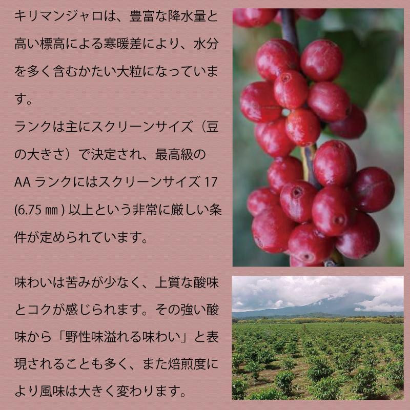 キリマンジャロ山の麓で栽培されたコーヒー豆は、上質な酸味と豊かなコクが特徴で、甘酸っぱく野性味の漂う味わいとなっています。