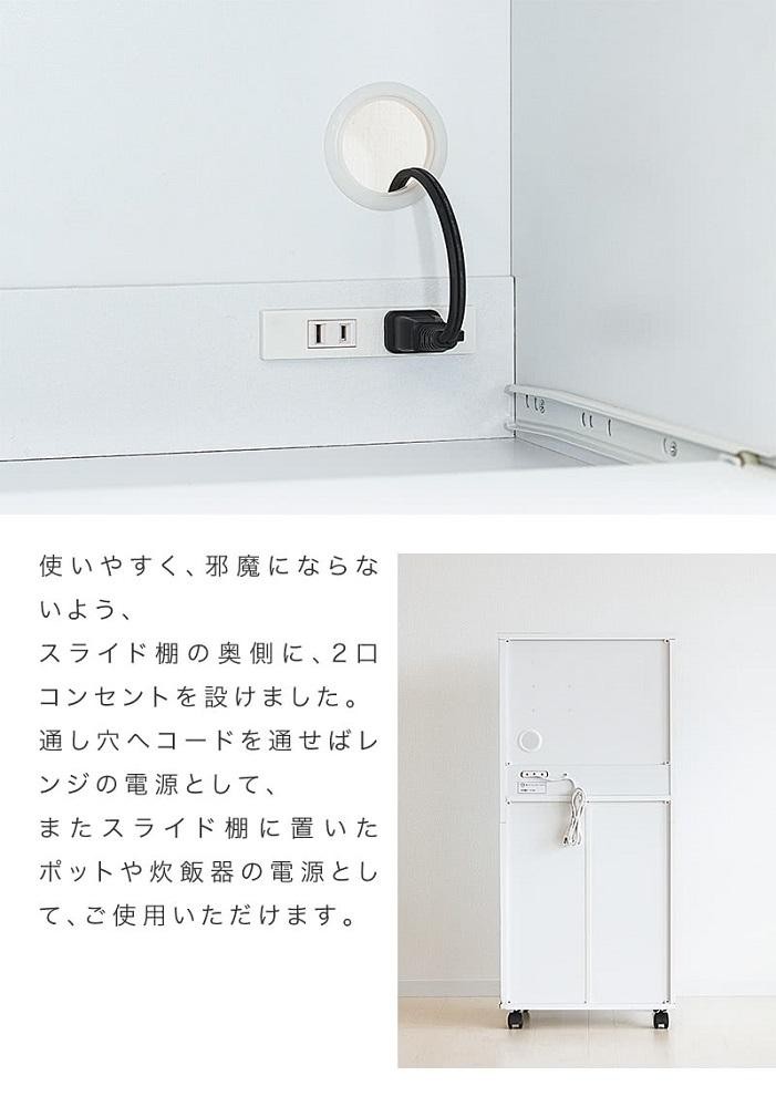 安心安全と日本のライフスタイルに寄り添うことをコンセプトに日本企画で開発しました。およそ幅50cm×奥行40cmの電子レンジ台です。一般的なオーブンレンジを置くのにちょうど良いサイズ設計です。上段のスライド棚は炊飯ジャーや湯沸かしポットを置くのに便利な2口コンセント付き。中段の引き出しはお箸や布巾などキッチン小物の整理に使えます。下段の扉収納はフライパンやお鍋の収納ができます。また可動棚を外せば2Lのペットボトルも入ります。掃除の時に簡単に移動できるキャスター付き。1K、1DKの狭いキッチンで活躍する小さいレンジボードです。1人暮らしの学生や新社会人、単身赴任の方におすすめ。