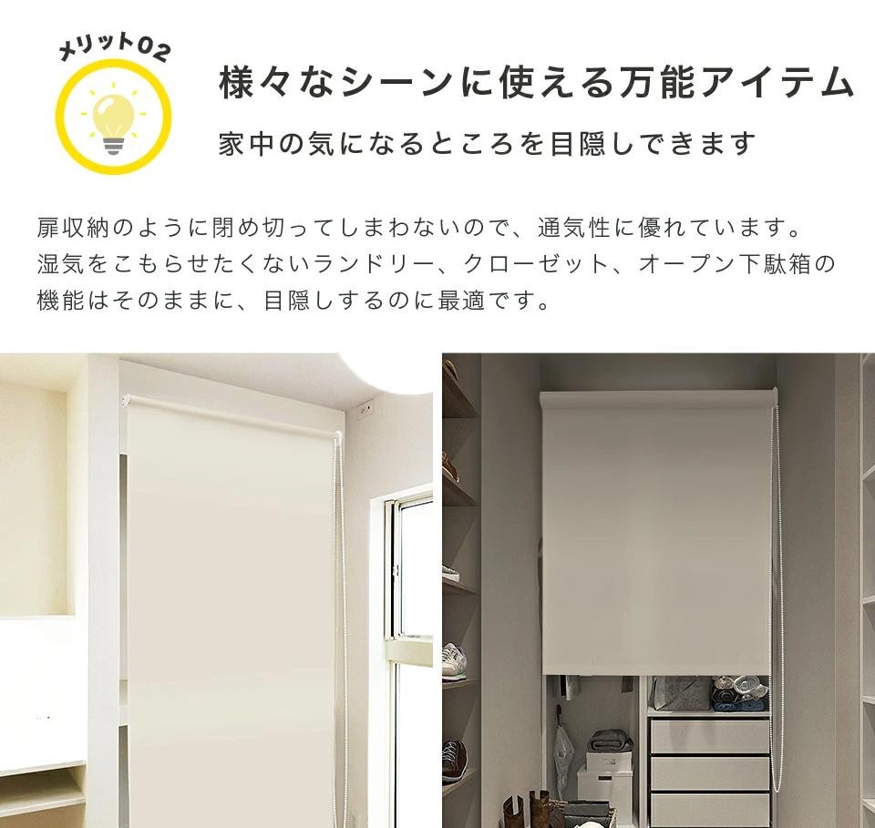 床から天井までの大容量突っ張り本棚にも取付できる専用金具付きロールスクリーンです。高さ250cmを覆い隠せるスクリーンは、簡単に目隠しを行い、室内をすっきり見せてくれます。ラックの天板上に専用アングルで取り付けるだけ。簡単に本格的な目隠しを配置できます。本棚以外にも洗濯機置き場やキッチンパントリーなどなど、アイデア次第で使用方法は無限大。オープン下駄箱の目隠しにも、扉施工よりコストが安く、通気性に優れており最適です。