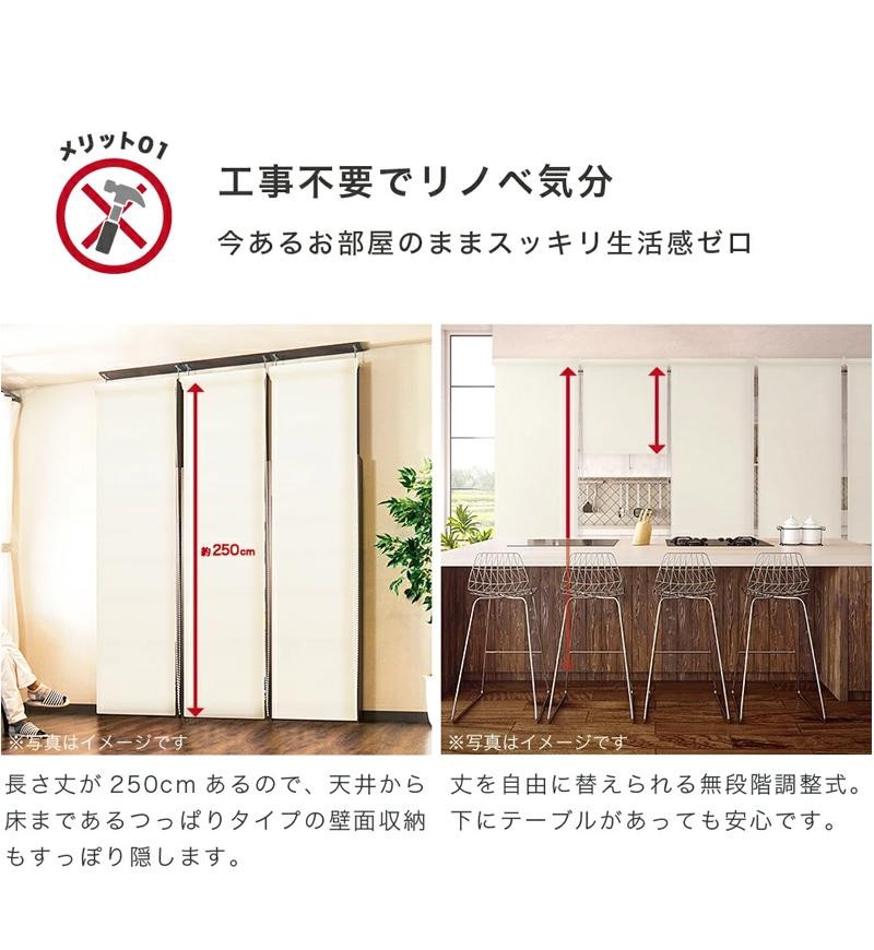 床から天井までの大容量突っ張り本棚にも取付できる専用金具付きロールスクリーンです。高さ250cmを覆い隠せるスクリーンは、簡単に目隠しを行い、室内をすっきり見せてくれます。ラックの天板上に専用アングルで取り付けるだけ。簡単に本格的な目隠しを配置できます。本棚以外にも洗濯機置き場やキッチンパントリーなどなど、アイデア次第で使用方法は無限大。オープン下駄箱の目隠しにも、扉施工よりコストが安く、通気性に優れており最適です。