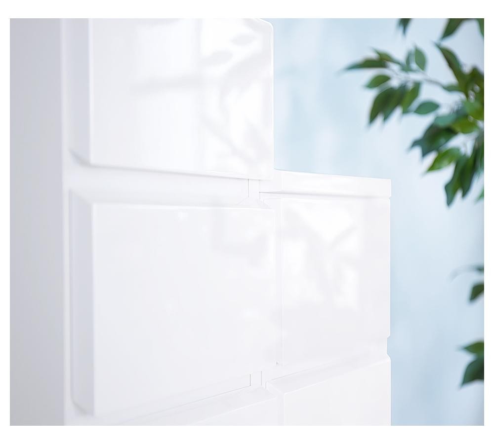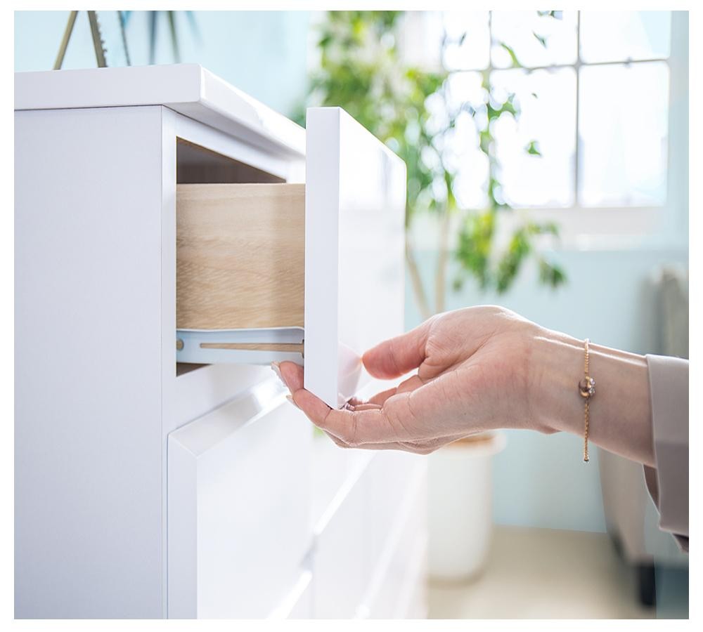 スリットに隠れた取っ手がシンプルな「フラットパネルデザイン」と美しい光沢のホワイト塗装が引き立つデザインチェストです。