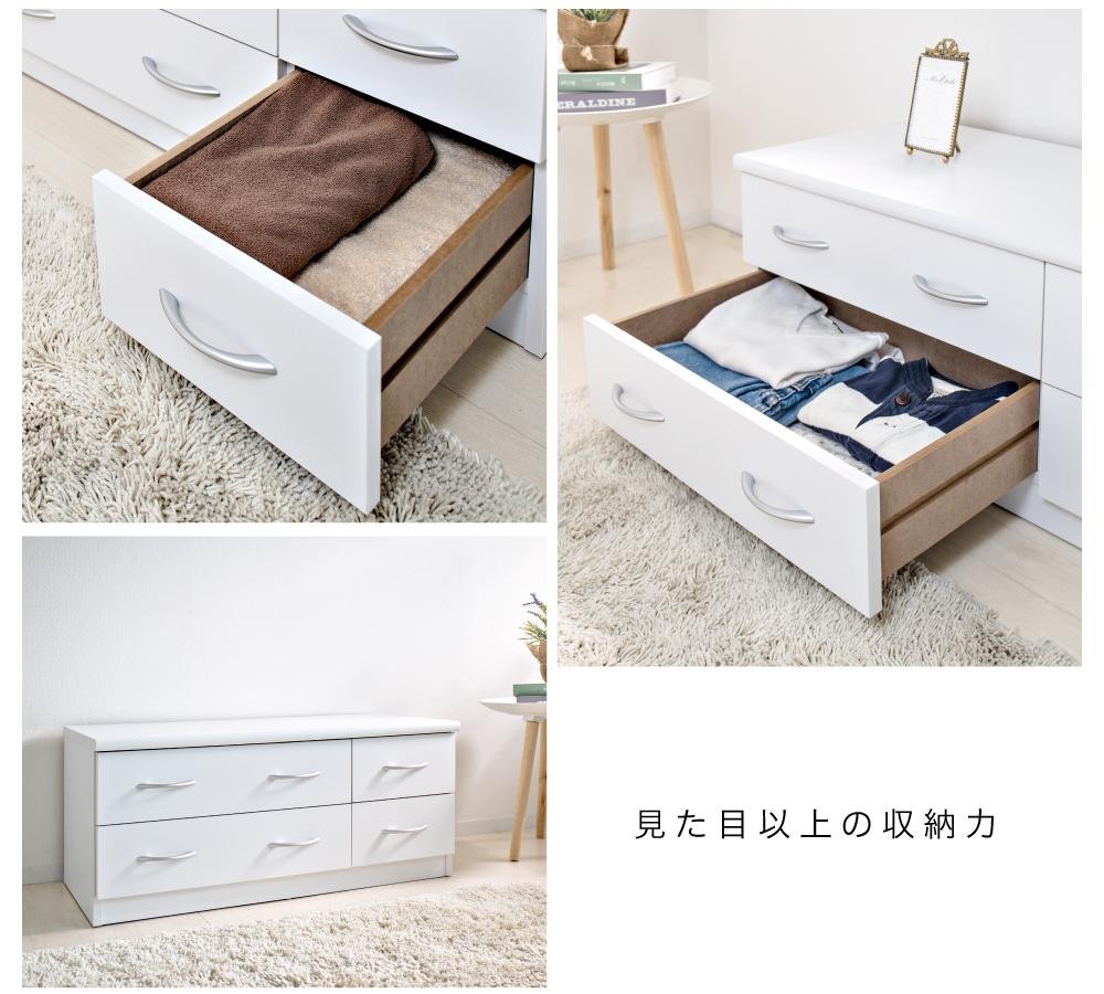 | 容量 | 【カラー】 ホワイト(白) 【サイズ】 [外寸] 約 W(幅)89.5×D(奥行)41×H(高さ)39.5cm [引出し内寸] (小2杯) 約 W24.5×D33.5×H10.5 cm (大2杯) 約 W53.5×D33.5×H10.5 cm 重量:約20kg 組立て式 【原材料名】 プリント紙化粧繊維板 |