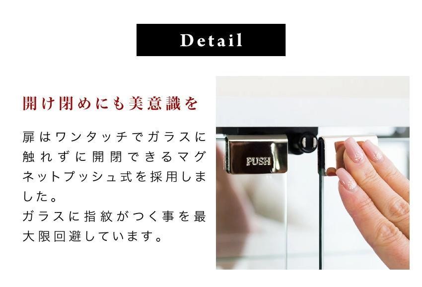 背面ミラーで奥行きが感じられ、前板・棚板・側面はガラスのため開放的な雰囲気。