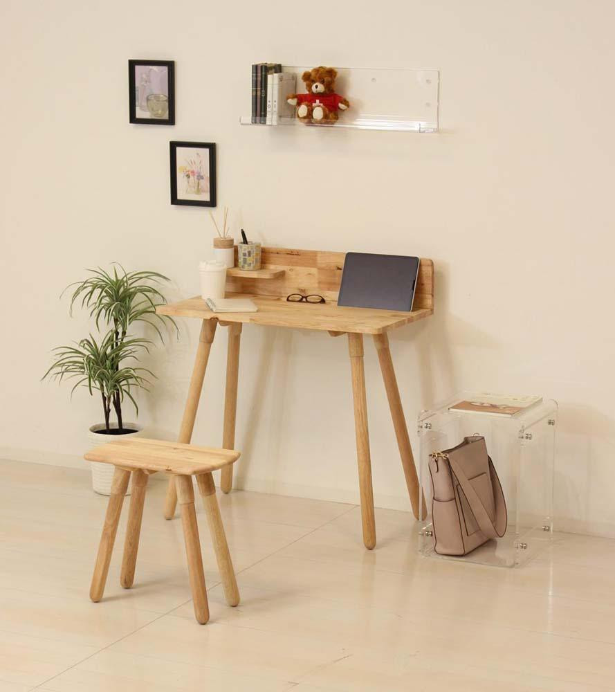木を捨てることなく全て使うことで、SDGsを考えたデスクとスツールの2点セットです。節や色の濃淡等、天然木の風合いをありのままお楽しみいただけて、高さ調整も可能です。ステーショナリーを置く場所やカップホルダー、小物を置ける棚と、コンパクトながら使いやすさを考えたデスクセットです。