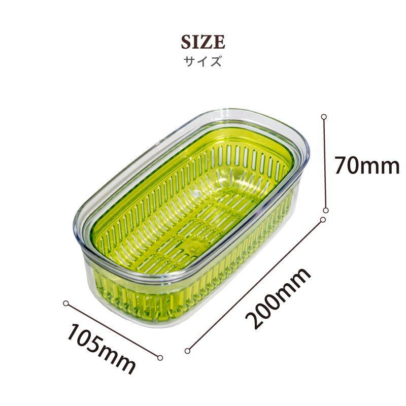 フタと本体は透明にこだわり中身や鮮度が冷蔵庫に入ったままでもすぐにわかるようになっています。ザルは水が切れやすい構造。保存中に野菜から落ちる水に野菜が触れないよう、ザルに脚をつけています。容器はそのまま食卓にも出せるデザインにこだわりました。ボウルは幅10.5・奥行20・高さ7cmのスリムサイズ。