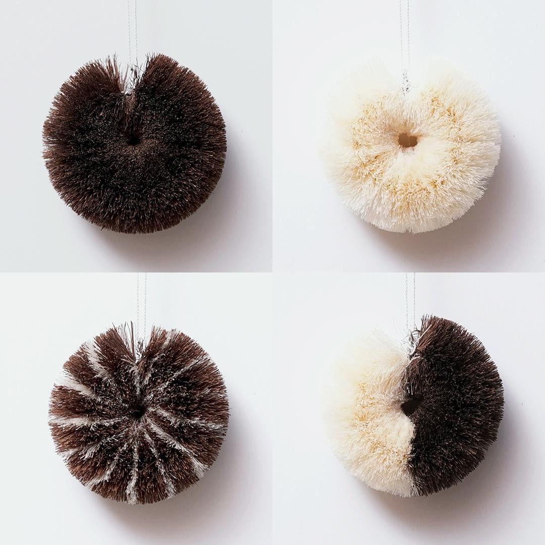 チョコ、ホワイト、ハーフにマーブル味?もっと多くの方に棕櫚たわしの良さを知り、慣れ親しんでいただきたいと、ドーナッツ型たわしをお作りいたしました。