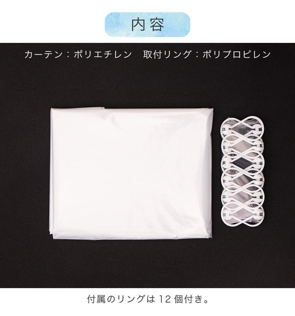 | 容量 | 【サイズ】 (約)幅180cm×丈250cm(厚さ50μm) 【原材料名】 カーテン:ポリエチレン/取付リング:ポリプロピレン |